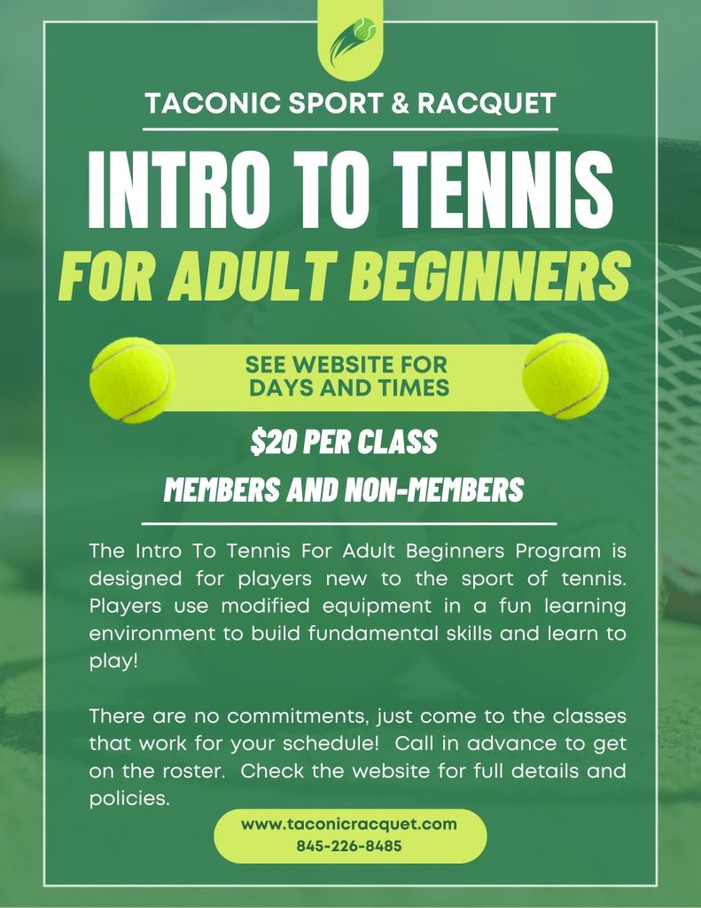 The Intro To Tennis For Adult Beginners Program at Taconic Sport & Racquet is designed for players new to the sport of tennis. Players use modified equipment in a fun learning environment to build fundamental skills and learn to play!