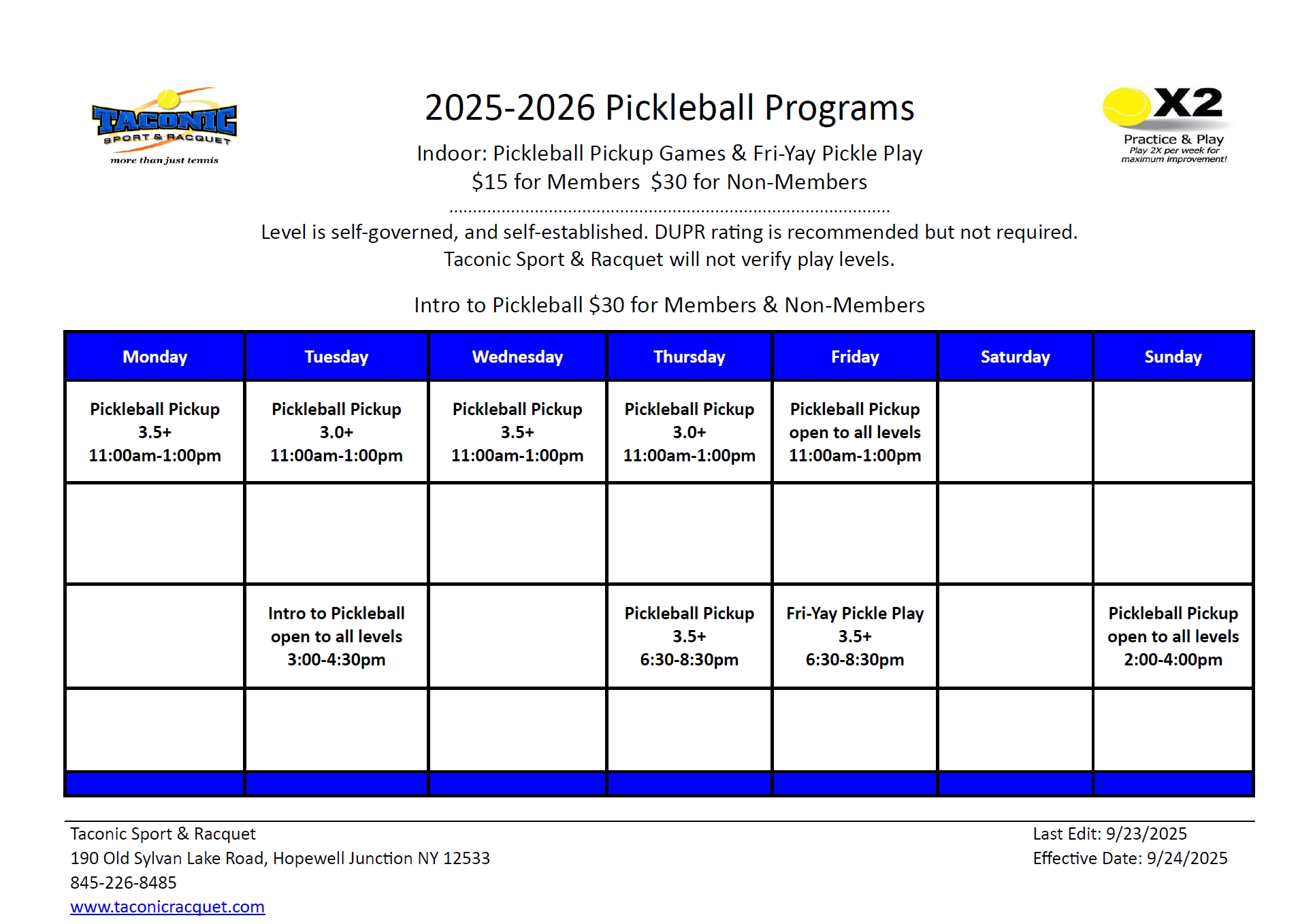 -Level is self-governed, and self-established. DUPR rating is recommended but not required. Taconic Sport & Racquet will not verify play levels.