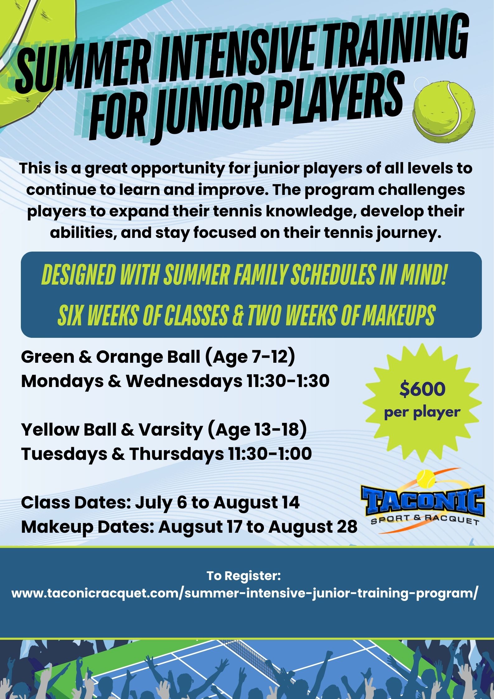 -Program is held on the indoor or outdoor courts at the sole discretion of TSR Management. Players should be prepared with a hat and sunscreen.